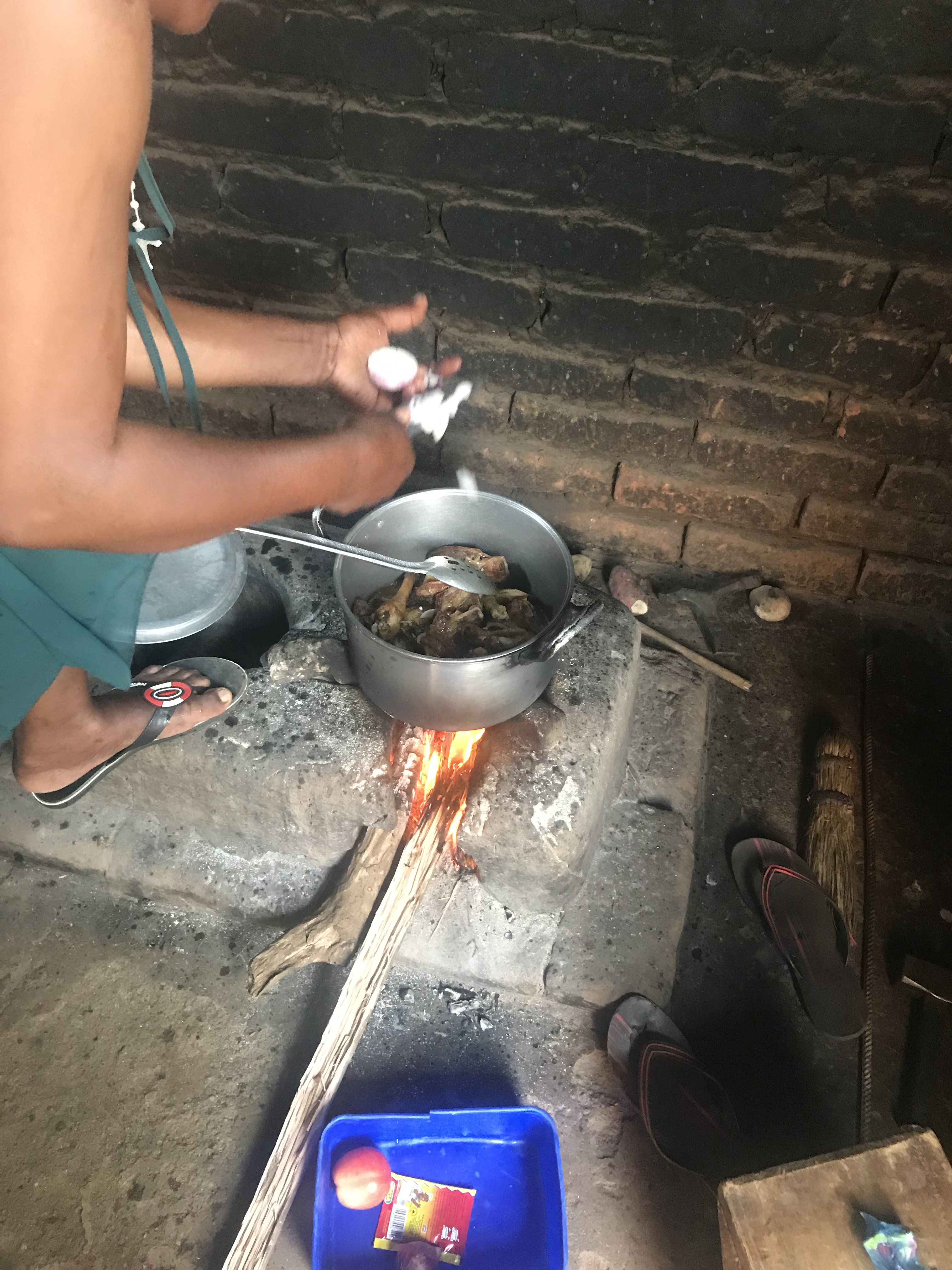 Kaum hatten wir fertig gegessen, begannen einige der Frauen, das Mittagessen vorzubereiten. Ein Huhn wurde geschlachtet und gerupft, aus einem Haufen Bohnen wurden die schlechten aussortiert und zwei Frauen schnitten einen großen Haufen Mangold, was alles seine Zeit brauchte. Gegen 13 Uhr fingen die ersten Frauen an, Nsima zu kochen. Dafür wurden drei oder vier kleine Feuer gemacht, auf denen parallel das Mehl-Wasser-Gemisch zubereitet wurde. Ich weiß nicht wie viele Töpfe Nsima die Frauen kochten, aber es waren sehr viele, wir waren jedoch auch viele Menschen. Nachdem Julia und ich eine Weile zugeschaut hatten, wie Nsima aus Cassava zubereitet wurde, durften wir beim kochen von Maismehl-Nsima mithelfen. Die Zubereitung von Nsima mit Cassava soll um einiges schwerer sein, da es fester wird und man dadurch um einiges mehr Kraft fürs Umrühren aufwenden muss, als bei der Mais-Variante. Eda und Dunia zeigten mir, wie ich mit dem großen Holzlöffel rühren musste, während Julia immer wieder Mehl dazu schüttete Zusätzlich zum Nsima wurde der Mangold zusammen mit Tomaten und Zwiebeln gekocht, genauso wie das Huhn und die Soja-Stücke, die als Ergänzung zum Huhn zubereitet wurden, das lange nicht für alle reichen würde.