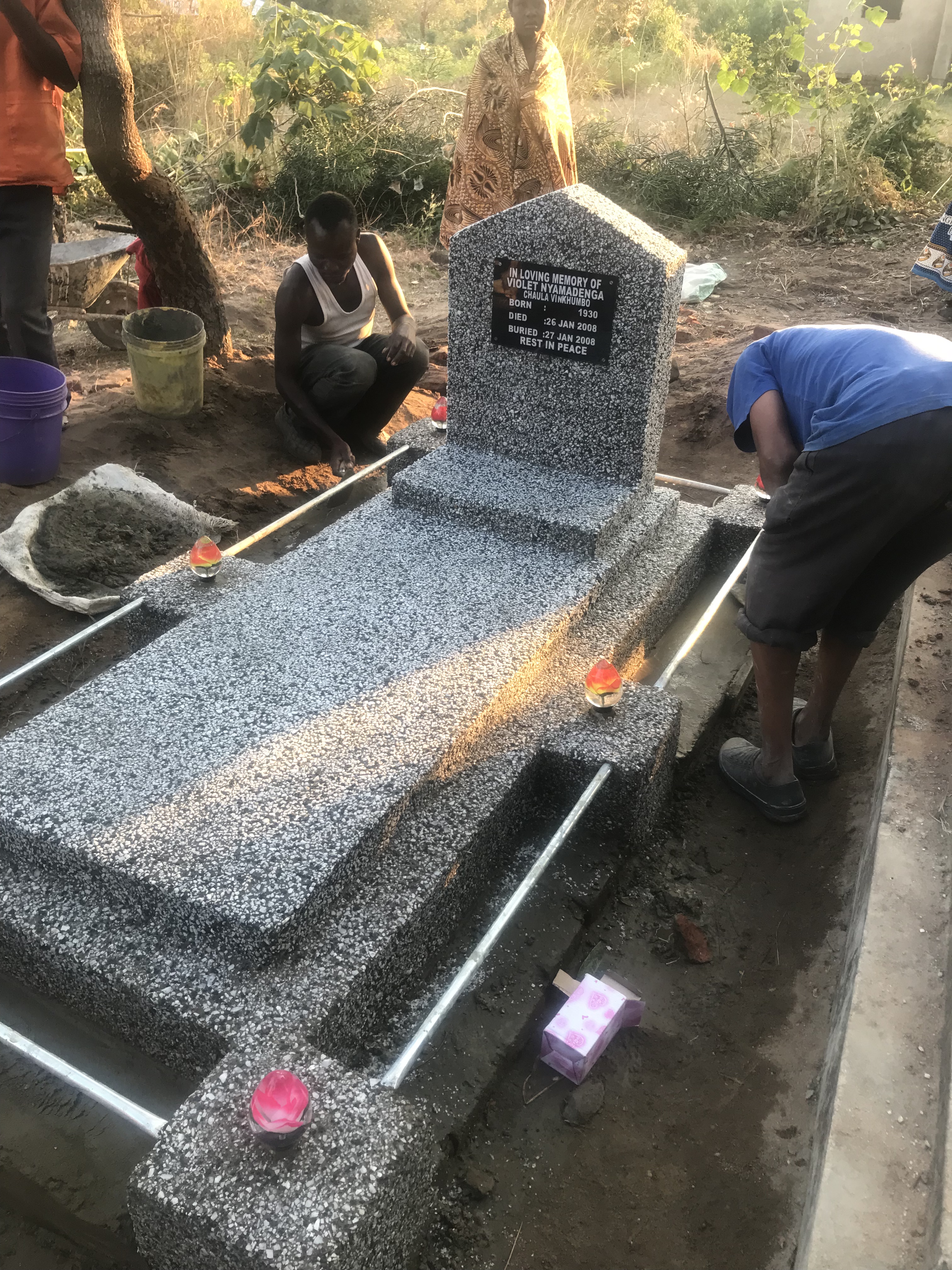 Kurz vor 10 Uhr ging Nyapeti wieder mit uns zu ihrer Familie. Dieses Mal fand das Treffen bei dem Haus von Nyapetis Schwester statt, bei dem wir schon am Abend zuvor kurz vorbeigeschaut hatten. Vor dem Haus auf dem Boden saßen wieder die gleichen Frauen, wie gestern. Die Männer waren hinter dem Haus wieder mit der Fertigstellung des Grabes beschäftigt, das sie mit schwarz glänzendem Stein bedeckten. Das Grab gehörte dem Mann von Nyapetis Schwester, der 2006 gestorben war.